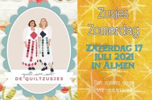 De quiltzusjes Hanneke Kwakkenbos van Quiltshop Vlijtig Liesje en Marijke Tabak van Atelier Hartendief organiseren een ‘Zusjes Zomerdag’ op zaterdag 17 juli in Almen, vlakbij Zutphen. Het is een geheel verzorgde dag, van 10.30 – 15.30 uur, met catering, een workshop (inclusief materiaal), een inspirerende lezing/show and tell en als je naar huis gaat een verrassende goodiebag. Tussendoor is er gelegenheid te shoppen bij de winkeltjes van Vlijtig Liesje en Hartendief. Ook kun je met mooi weer een wandeling maken of buiten op de Brink te zitten. Je hoeft alleen je naaigerei mee te nemen. Er is een nieuwe lift in het pand aanwezig en de locatie is rolstoel toegankelijk.